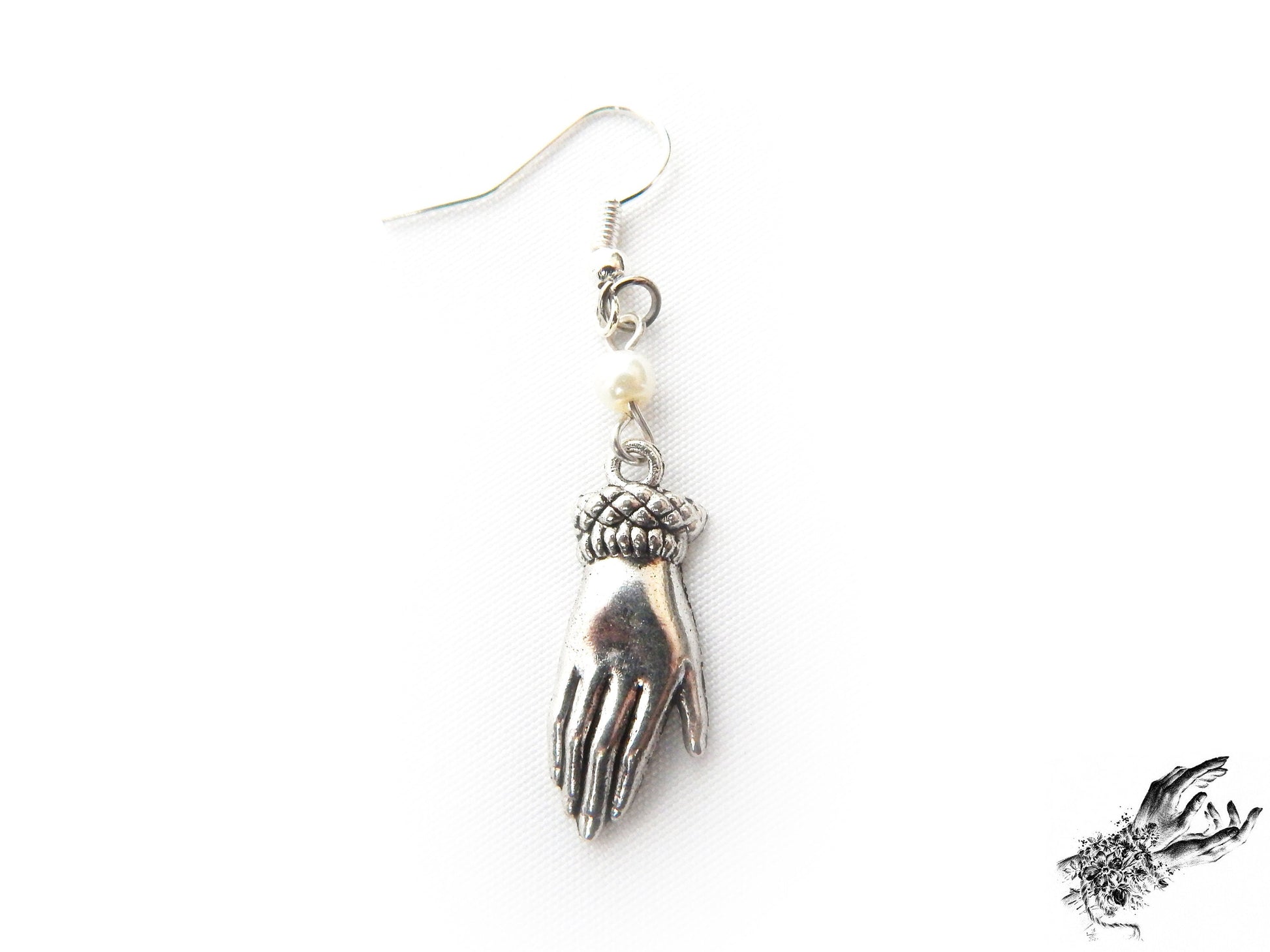 This is a pair of antique silver earrings featuring ornate hand charms and white pearls. These silver hand earrings make a unique gift to show your appreciation to anyone.