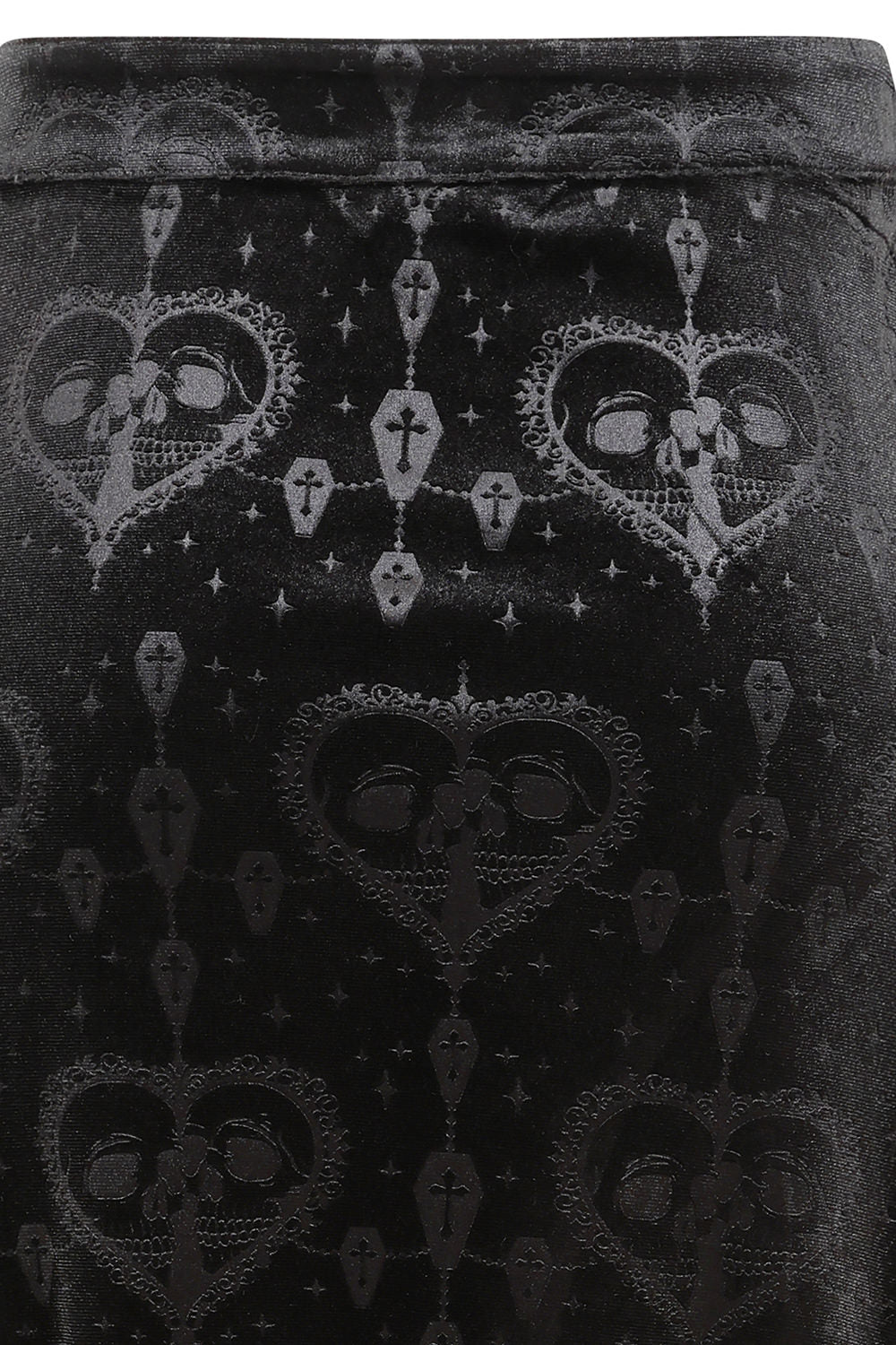 The Banned Trivia Skirt is a striking blend of gothic drama and elegance. Crafted from luxurious burnout velvet, this long black skirt showcases Banned’s exclusive in-house designed pattern, giving it a rich, textured finish. The result is a fabric that’s as darkly sophisticated as it is eye-catching.