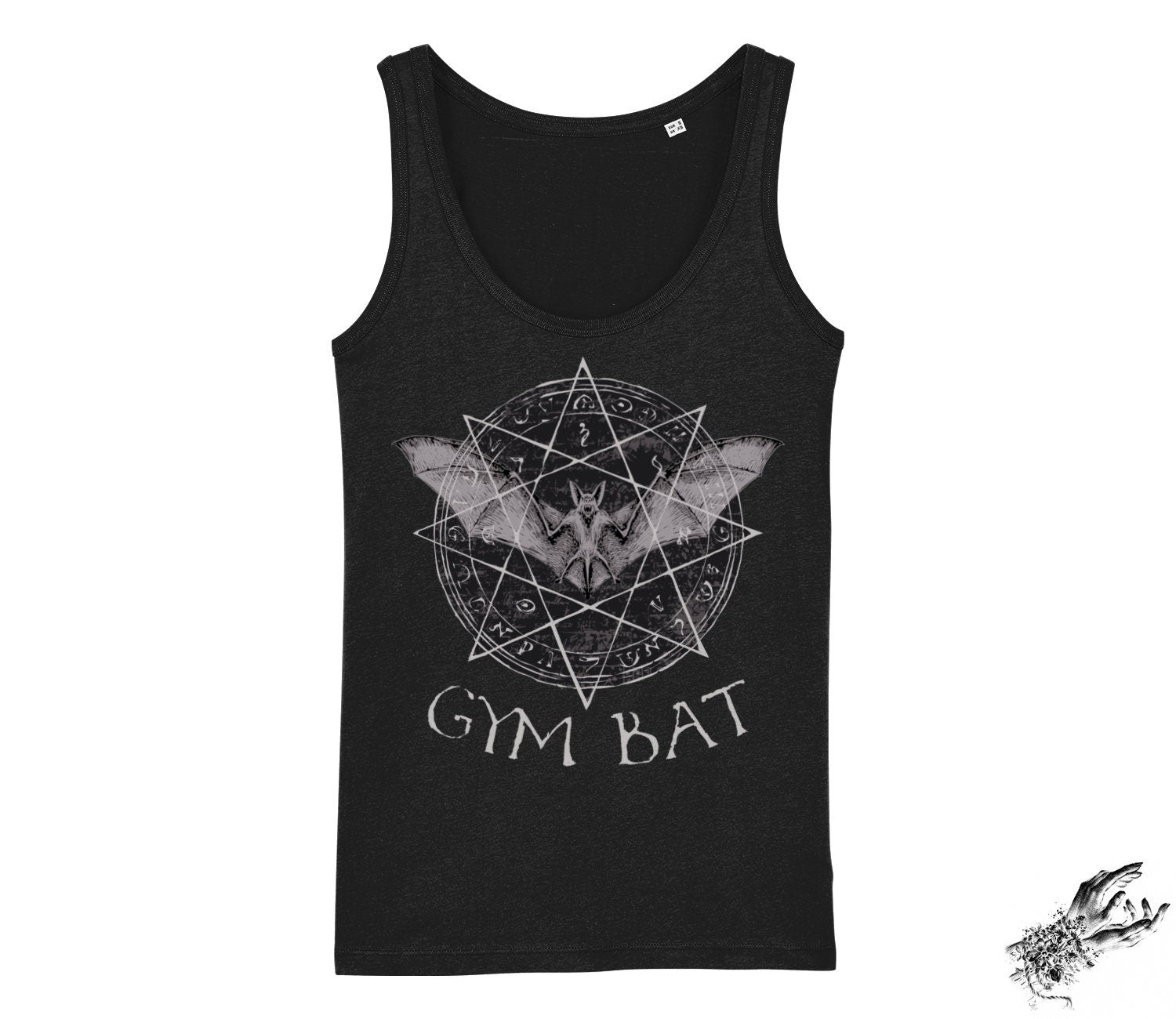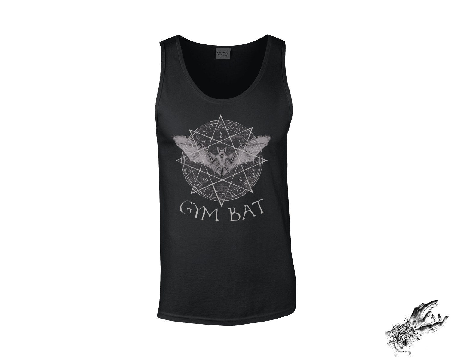 This is a black unisex tank top featuring an original design of a gothic bat with occult sigil and symbols, and the slogan "Gym Bat". This gothic tank top comes in two fits: fitted and baggy, for your personal style preference. It is a perfect gothic workout top, including for cardio, strength training, yoga and other exercise, or for the popular and edgy Health Goth fashion style. The high quality, crisply printed Gothic gym bat design is fade and crack resistant.
