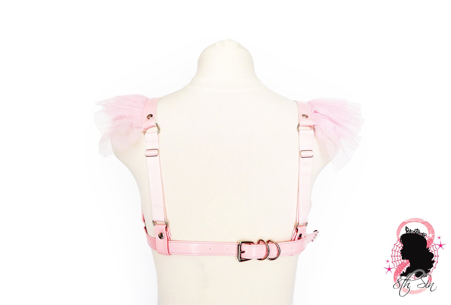 Made with pink vegan leather, pink tulle, satin faced elastic and stainless steel plated hardware. The harness bra is adjustable at the shoulders and back, and each faux leather end is finished with a stainless steel plated cap. The harness is made of the highest quality vegan friendly materials and is both fashionable and play-proof.