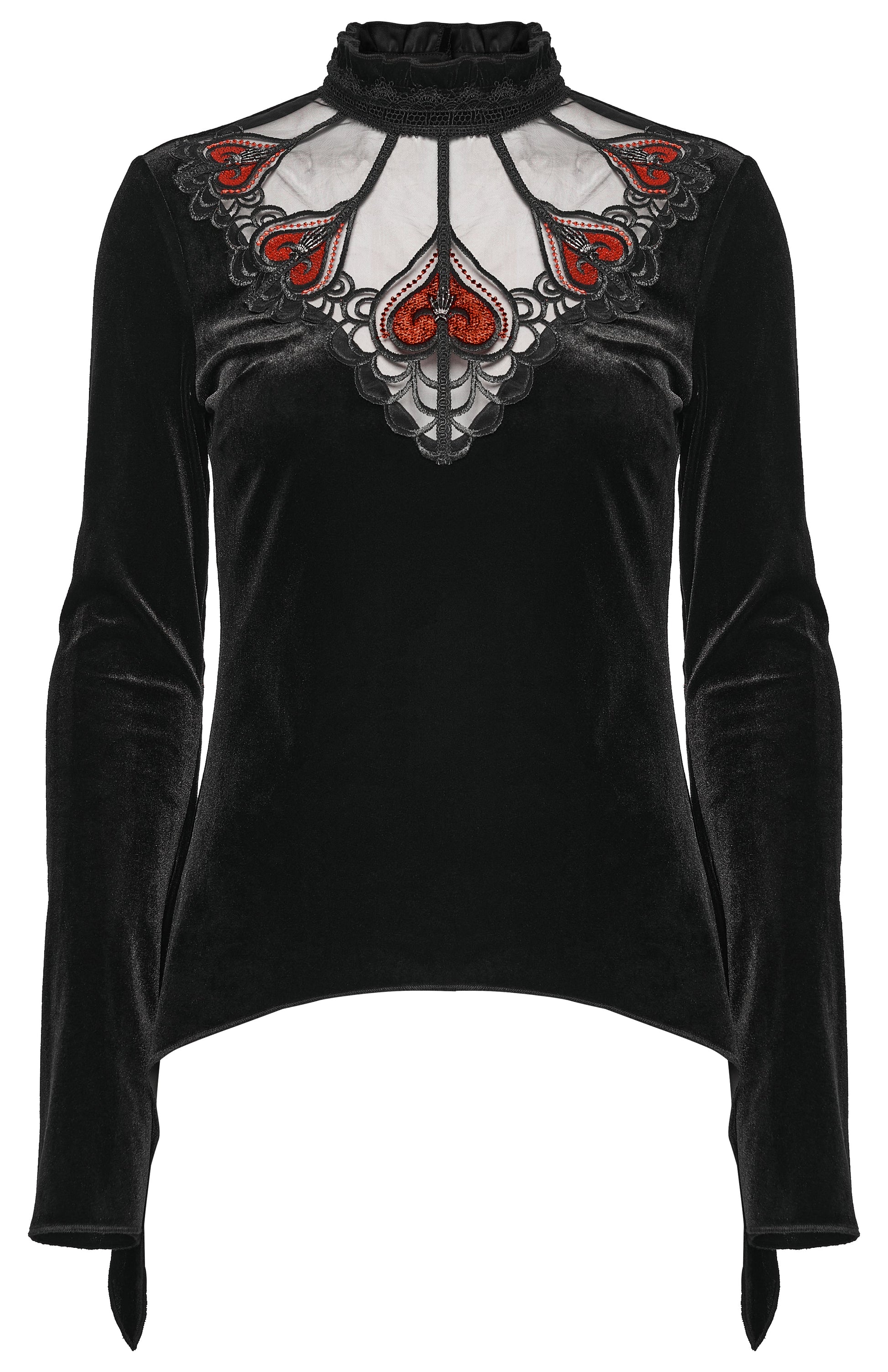 - Heart-shaped chest detail with intricate red and grey gothic embroidery
