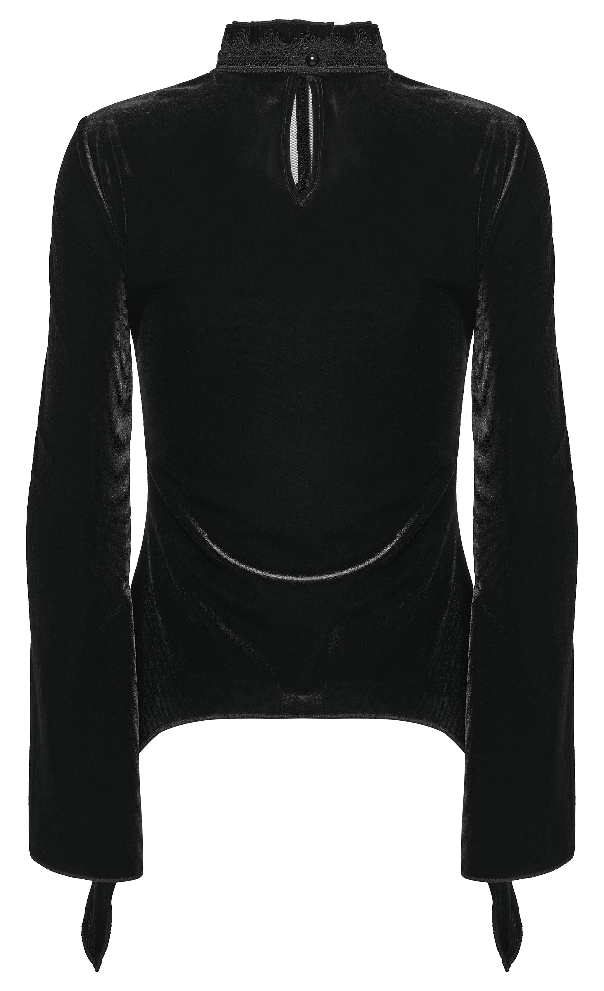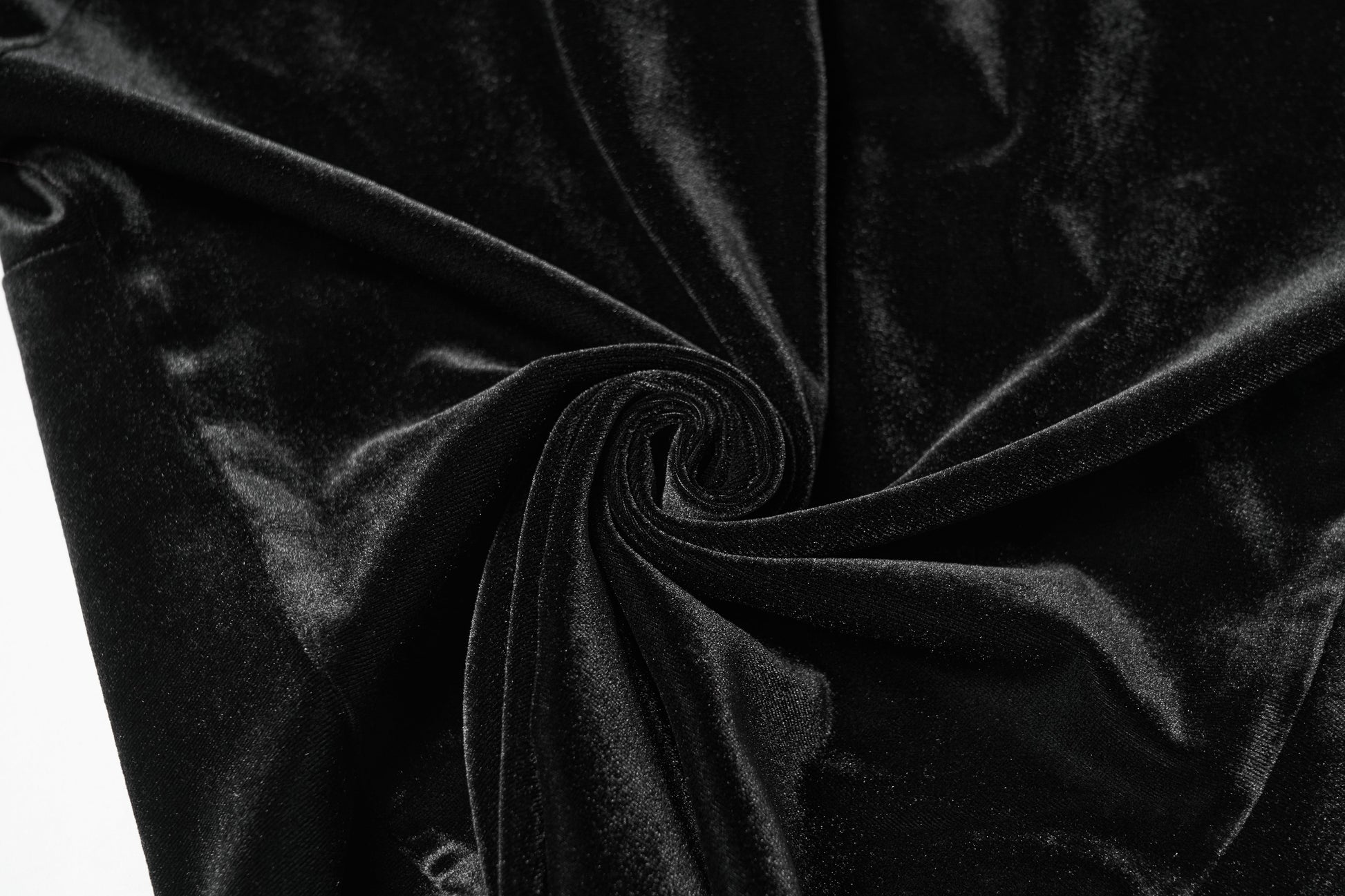 - Super-soft black velvet with a romantic stand-up ruffle collar
