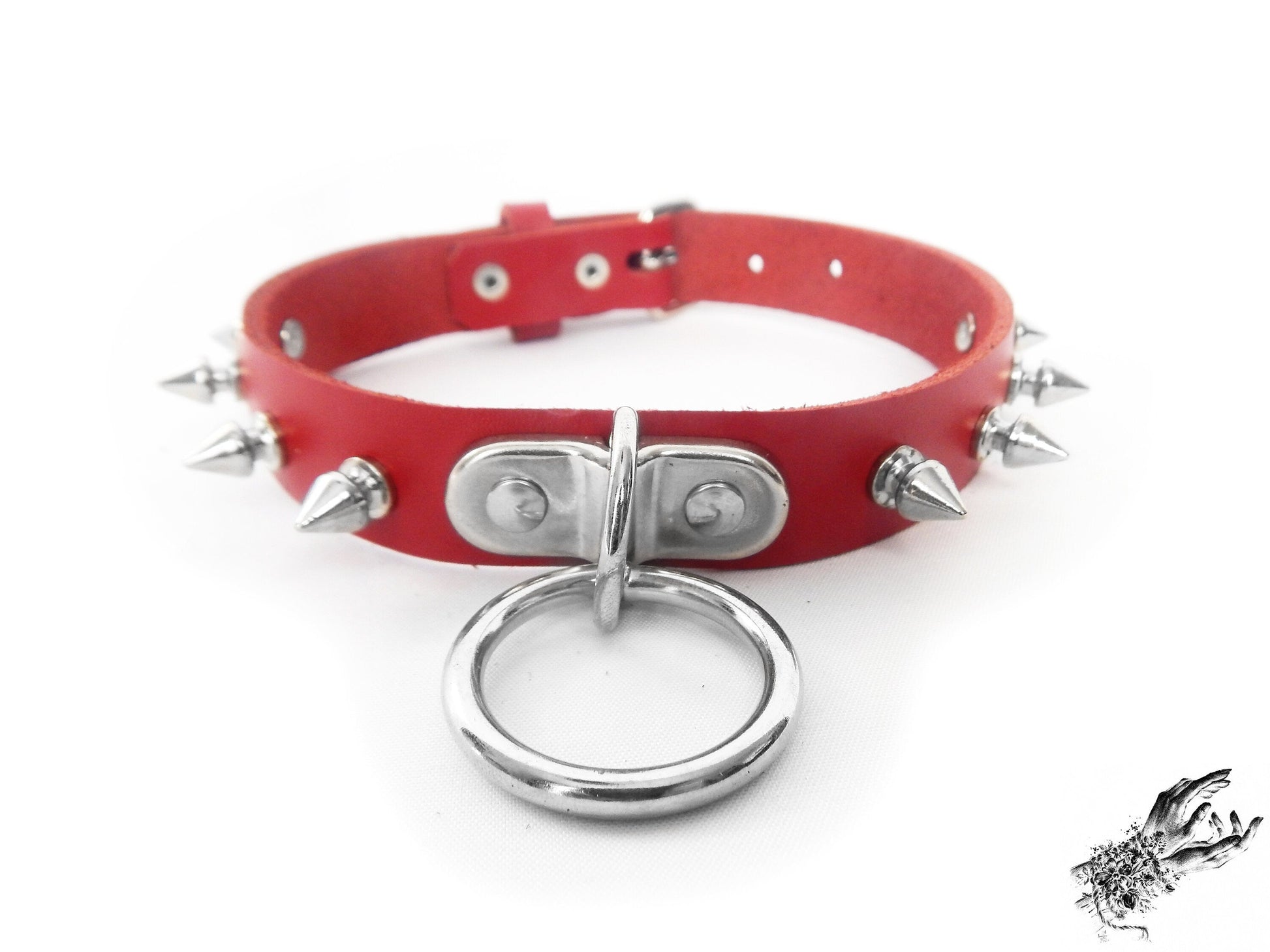 This is a red leather choker featuring a stainless steel plated D and O-ring attachment with spike studs. This red studded D and O-ring choker makes an alternative gift for gothic, punk, metal and other alternative fashion styles. The red O ring collar is suitable for fashion and play.